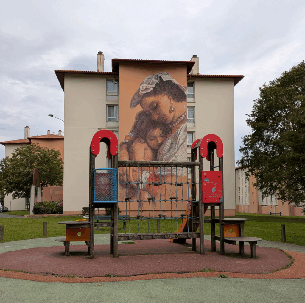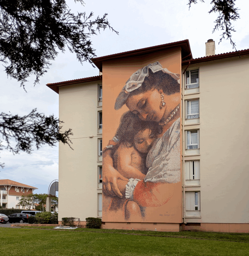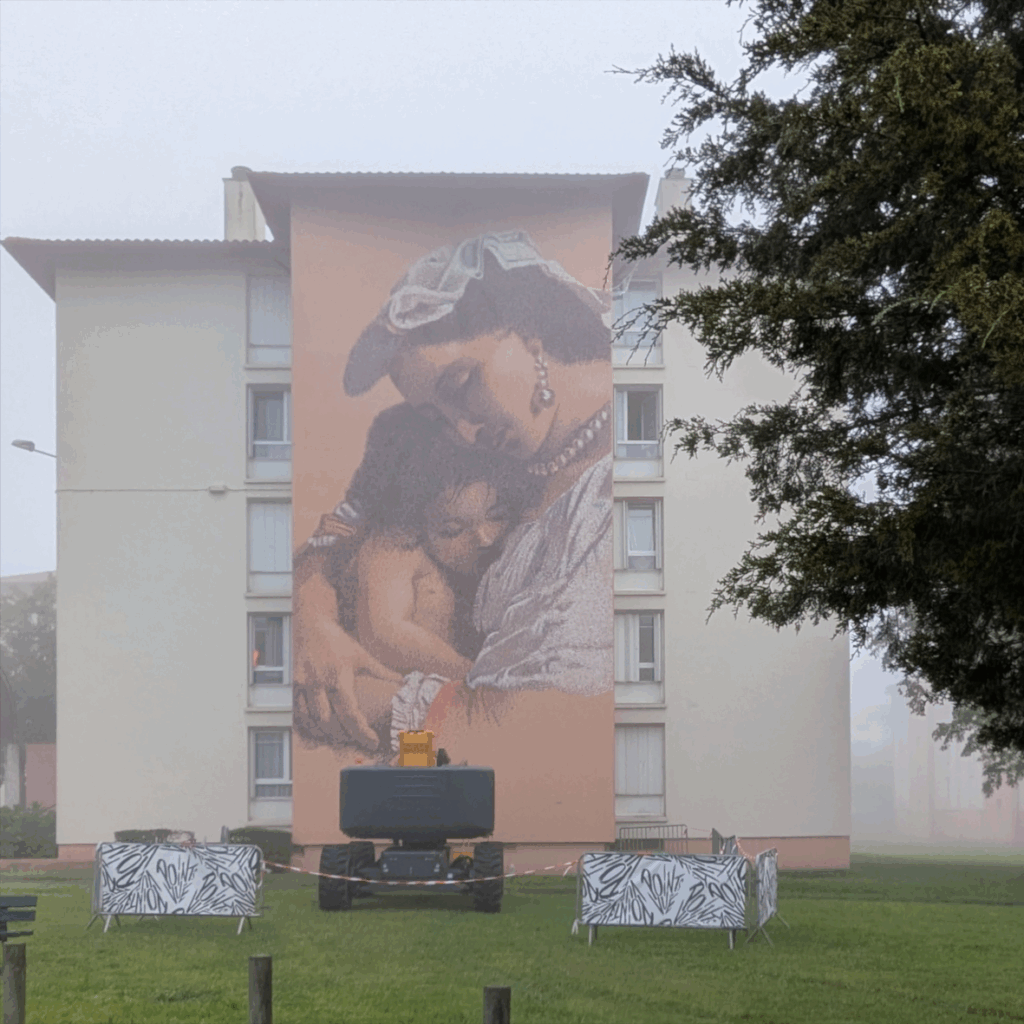 Cette grande peinture est située en plein centre ville, à l’arrière du théâtre municipal, rue de Ferrare.